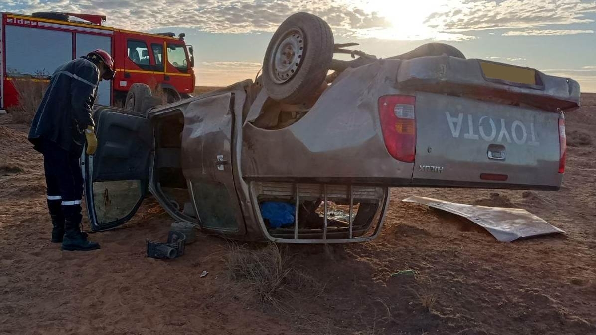 Les services de la Protection civile sont intervenus à 8h55 suite à une sortie de route suivie d’un tonneau. Le véhicule circulait sur la route départementale n°05 lorsque l’accident s’est produit dans une zone connue sous le nom de Fom El Matlak.
