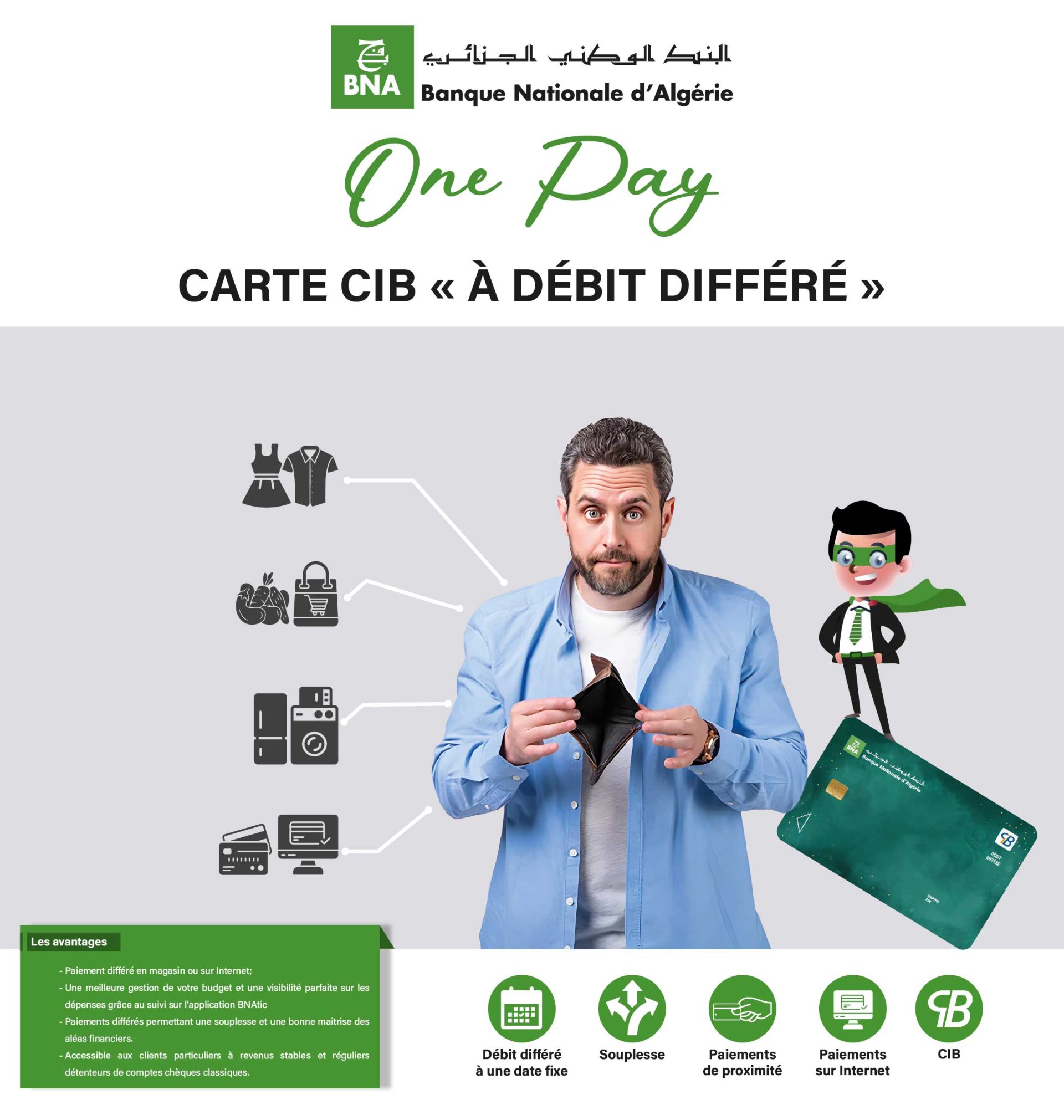 La carte « One Pay » de la BNA se distingue par son système de paiement à débit différé. Concrètement, les titulaires de cette carte peuvent effectuer des achats en ligne ou en magasin, ainsi que régler leurs factures, sans que les montants ne soient immédiatement débités de leur compte. L’ensemble des dépenses est regroupé et prélevé en une seule fois à la fin du mois.
