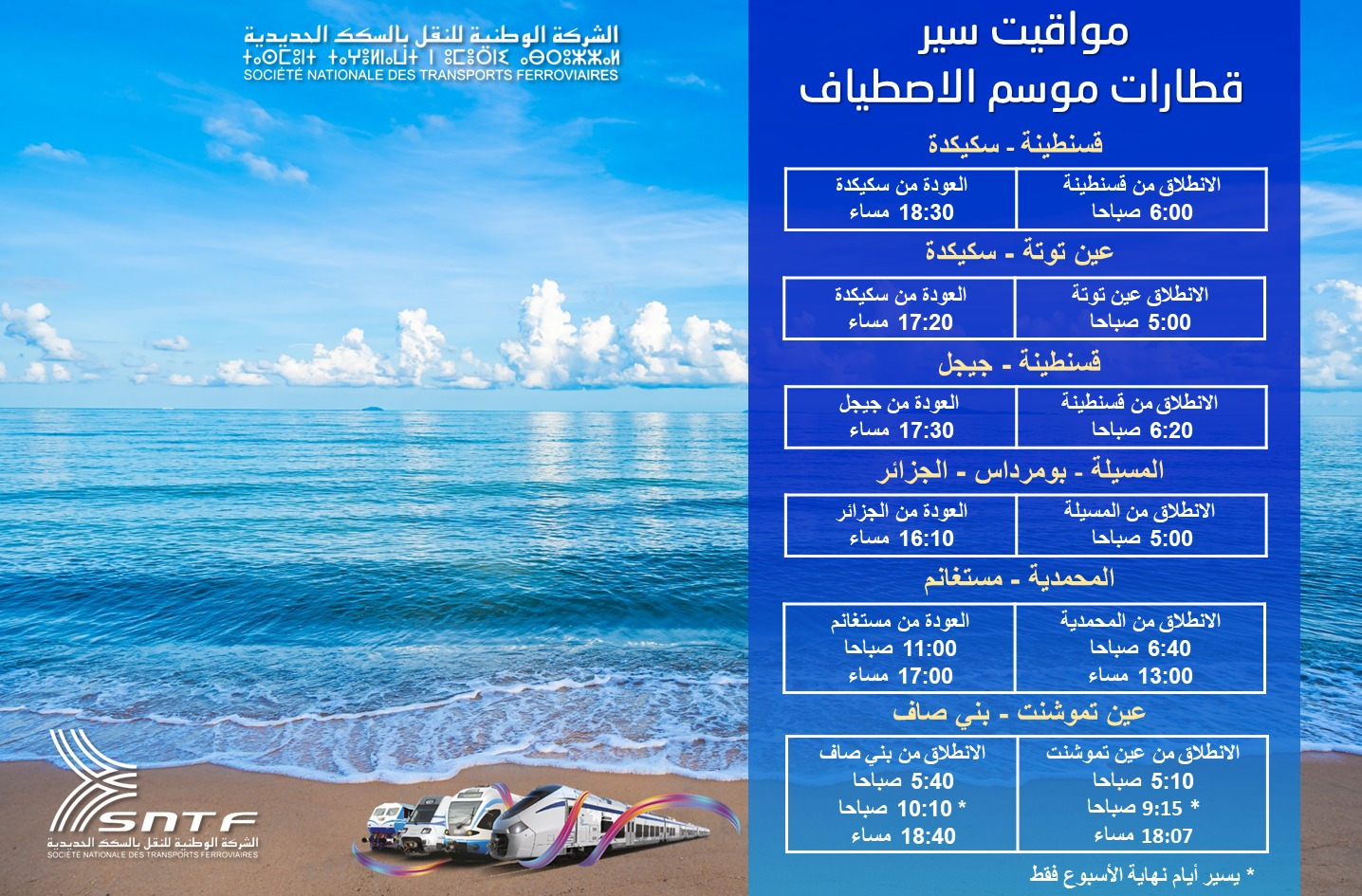 Il est conseillé aux passagers de vérifier les horaires avant leur voyage, car des modifications peuvent survenir. Pour plus d’informations, les voyageurs peuvent consulter le site officiel de la SNTF ou se renseigner directement auprès des gares. Il est également recommandé d’arriver en avance pour l’achat des billets et l’embarquement.